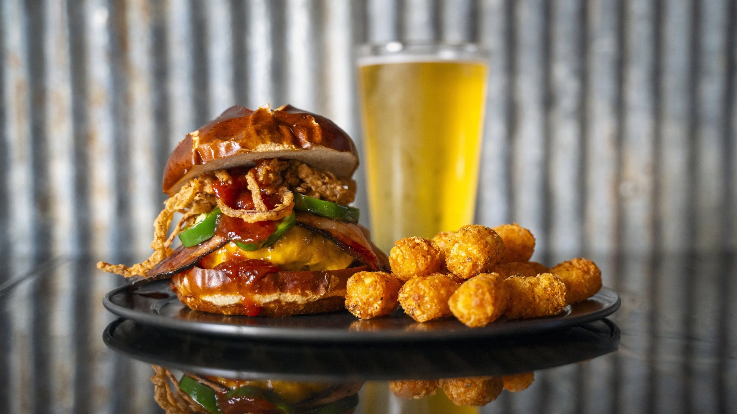 A juicy burger topped with lettuce, onion, tomato, bacon, and cheddar cheese — mayo and pickles on the side. Served with your choice of fries, tater tots, or chips.